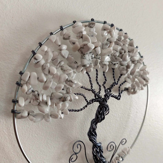 Bel arbre de vie en perles/chips howlite, monté sur un cercle de métal argenté, relié par du fil de cuivre au revêtement couleur argenté.