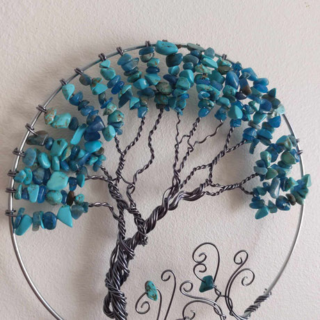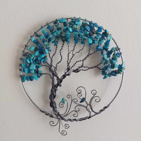 Bel arbre de vie en perles/chips de turquoise et apatites, monté sur un cercle de métal argenté, relié par du fil de cuivre au revêtement couleur argenté.
