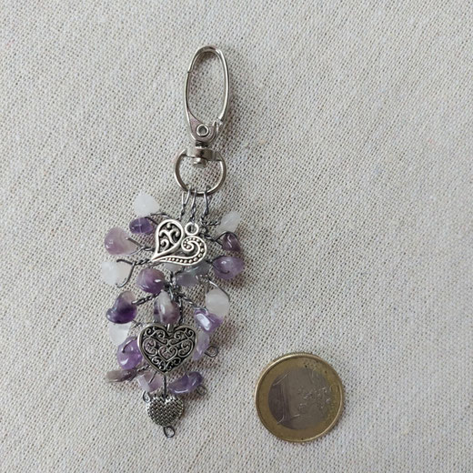 Magnifique bijou de sac figurant des breloques en métal argenté formant des coeurs.