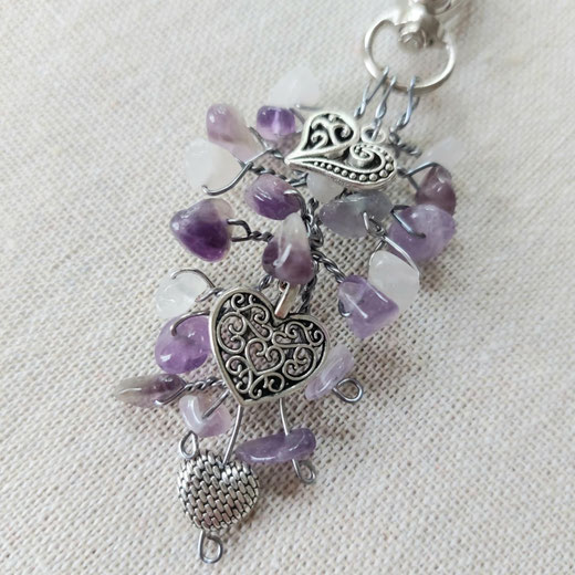 Ces apprêts ont reliés avec du fil de cuivre au revêtement couleur graphite que j'ai délicatement torsadé pour les fixer à un mousqueton de métal argenté que vous pourrez attacher à l'anse de votre sac ou selon votre désir.