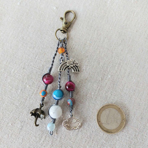Magnifique bijou de sac figurant des  breloques en métal argenté et broze formant un nuage chevauchant un arc-en-ciel, un parapluie et un nuage.