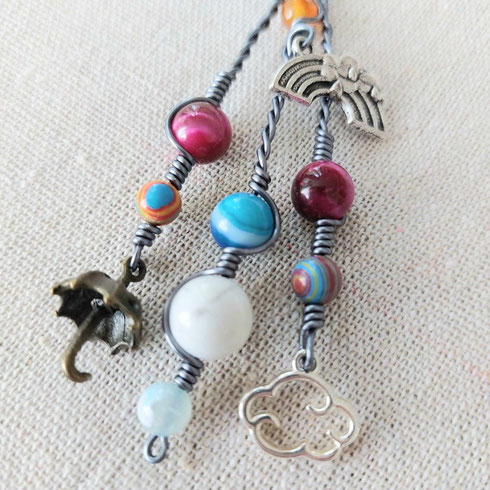 Bijou de sac arc en ciel parapluie nuage agate howlite oeil de tigre fuchsia fait main l' arche de Jessica