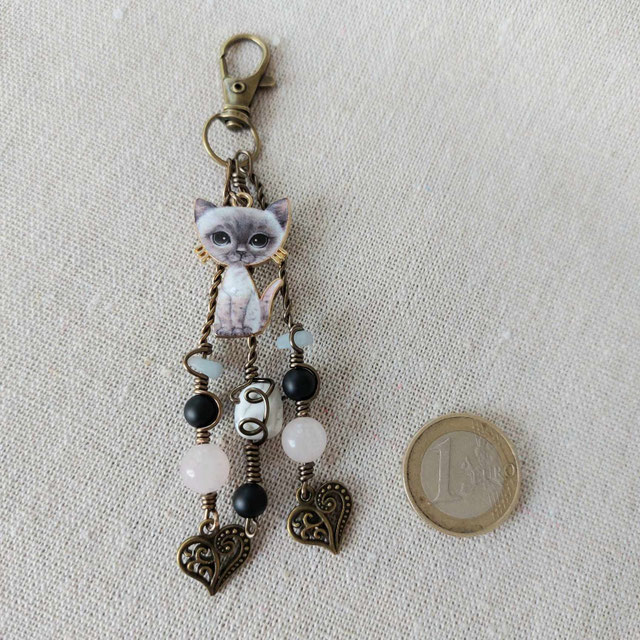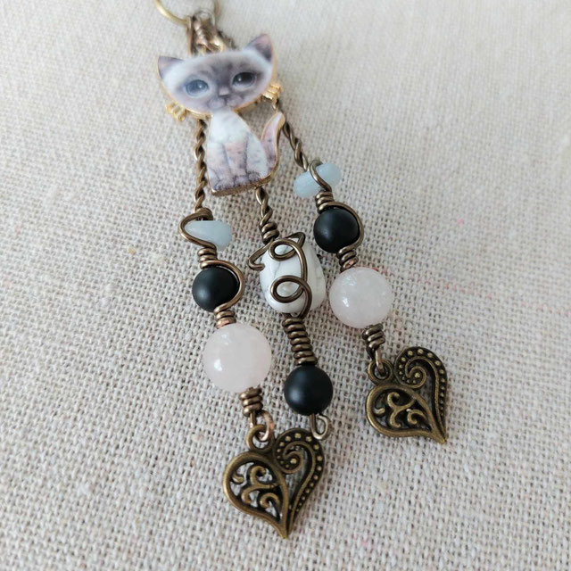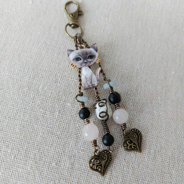 Magnifique bijou de sac figurant un chat au charme kawaii ( breloque en métal couleur doré, émaillée ), environné de perles naturelles ( malachite noire et blanche, onyx, quartz rose, angélite ) et de breloques en métal couleur bronze en forme de coeur.