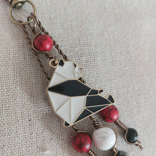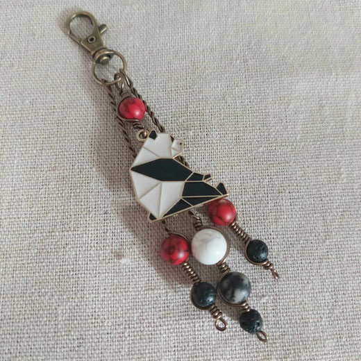 Magnifique bijou de sac figurant un panda ( breloque en métal couleur doré émaillé, façon origami), environné de perles semi précieuses et naturelles ( howlite rouge et blanche striée de gris, pierre de lave)