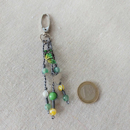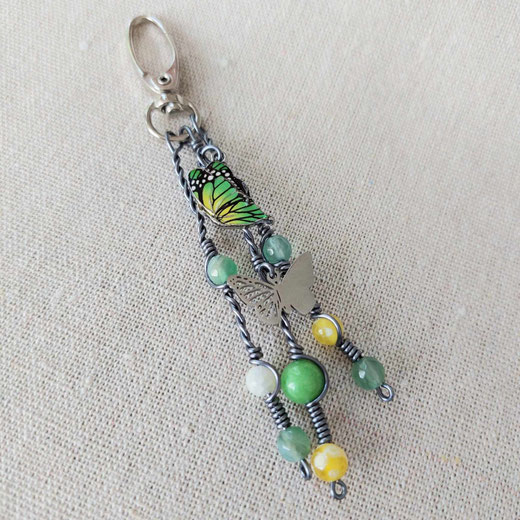 Magnifique bijou de sac figurant un papillon vert et jaune ( breloque en métal couleur argenté, émaillée ), environné de perles de pierres naturelles ( jade, agates ).Breloque en acier inoxydable en forme de papillon.