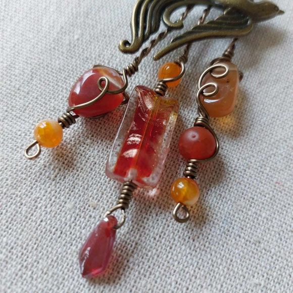 Magnifique bijou de sac figurant un phénix, en plein envol ( breloque en métal couleur bronze), environné de perles semi précieuses ( corail rouge, cornalines, agates craquelée orange, agates).
