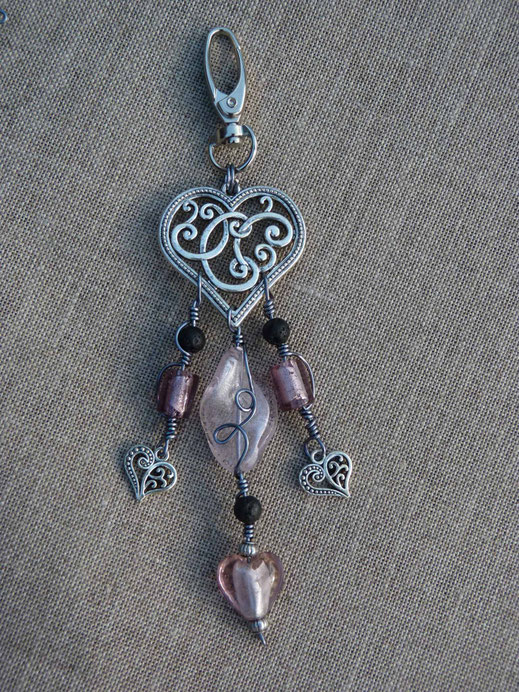 Ravissant bijou de sac figurant des breloque en métal argenté formant des coeurs aux jolies arabesques et entrelacs.