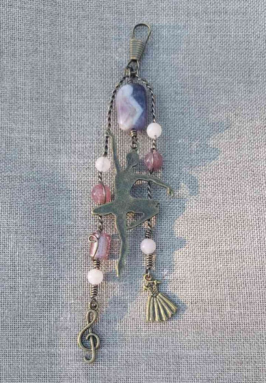 Bijou de sac bronze danseuse verre de Murano quartz rose, lépidolites, clé de sol, tutu, fait main l'Arche de Jessica