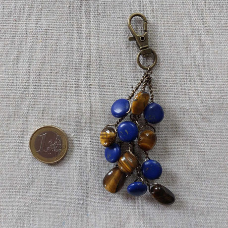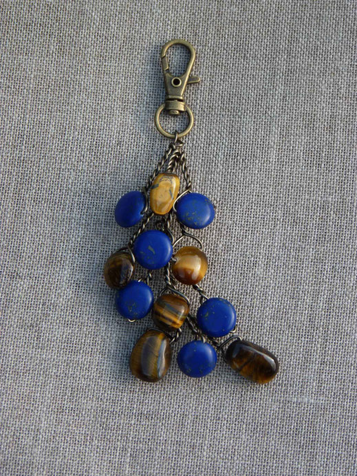 Bijou de sac formant comme une vague composée de perles circulaires plates en pierres semi précieuses, lapis lazuli et oeil de tigre.