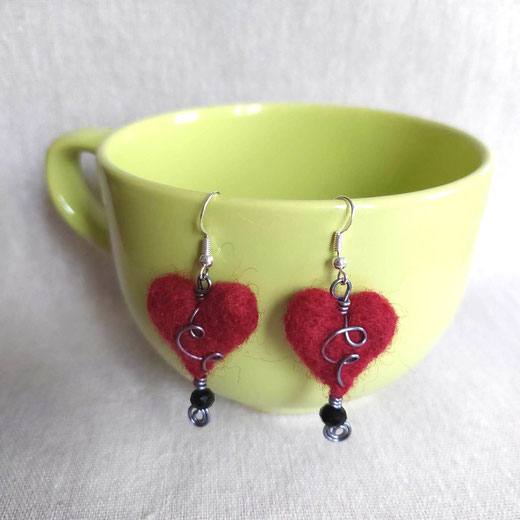 Charmantes boucles d'oreilles composées de coeurs en laine bordeaux, ultras légers, que j'ai patiemment feutré.