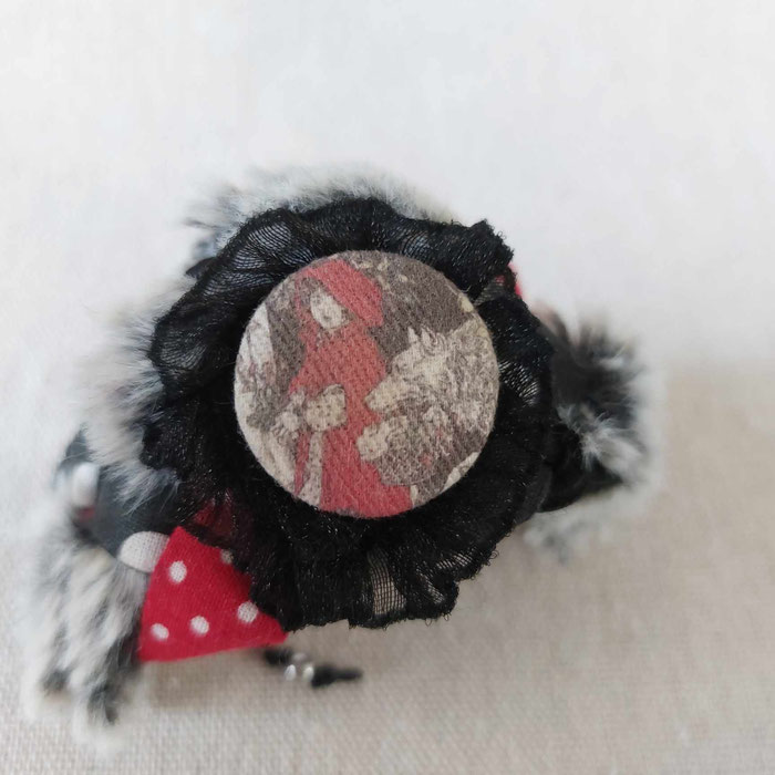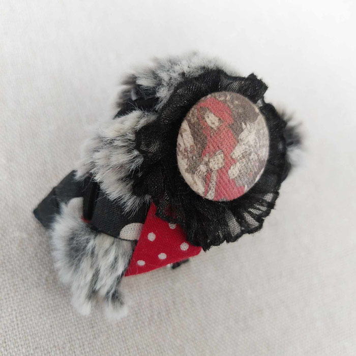 Bracelet composé d'un magnifique bouton recouvert de tissu représentant le petit Chaperon Rouge et le Loup, au charme rétro. Bouton agrémenté d'un ruban d'organza froncé noir.
