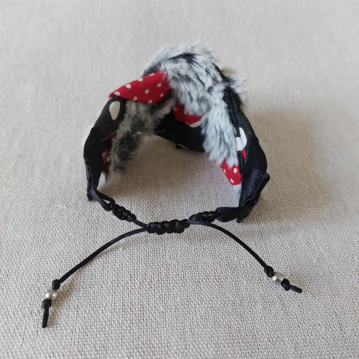 Tresse en tissu rouge à pois blancs, tissus noir à pois blancs et d'un tissu imitation fourrure, ultra doux.