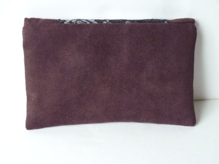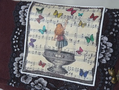 Belle petite pochette pouvant accueillir votre chéquier ( format porte-feuille), cartes et argent liquide. Pratique et esthétique avec son style victorien figuré par un magnifique transfert sur tissu mettant en scène Alice aux Pays des Merveilles essayant d'attraper des papillons avec en arrière plan une partition des notes de musique. Suédine douce au touché velouté de daim prune. Dentelle gris aux motifs fleuris. Breloque en métal couleur bronze formant un papillon; Intérieur en tissu matelassé noir, fermé par un bouton pression aimanté;