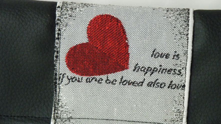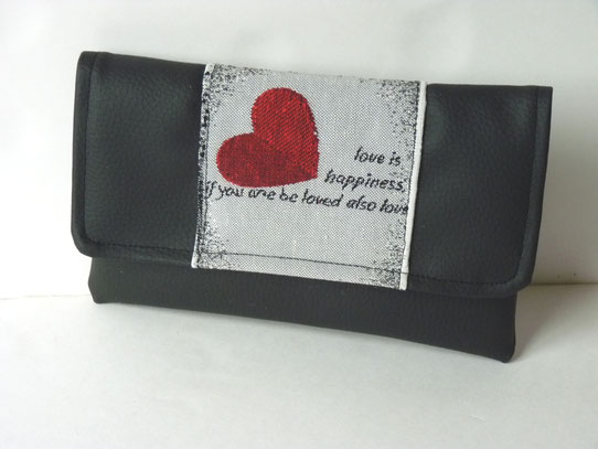 Belle petite pochette pouvant accueillir votre chéquier ( format porte-feuille), cartes et argent liquide. Pratique et esthétique avec son style romantique, figuré par un magnifique tissu jacquard romantique figurant un coeur avec une inscription, " love is happiness, if you are be loved also love". Au verso, coupon figurant une rose déposée sur un livre ouvert. Simili cuir noir; Intérieur en tissu matelassé noir, fermé par un bouton pression aimanté;