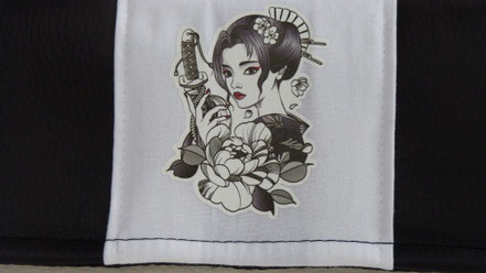 Belle petite pochette pouvant accueillir votre chéquier ( format porte-feuille), cartes et argent liquide. Pratique et esthétique avec son style manga, figuré par un magnifique transfert mettant en scène une femme aux allures de guerrière ou de Geisha tenant un sabre, environnée de rose et de fleurs de cerisier. Simili cuir blanc et noir. Intérieur en tissu matelassé noir, fermé par un bouton pression aimanté; Pour aventurière stylée !