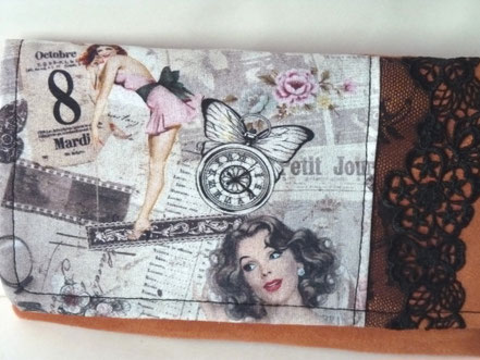 Belle petite pochette pouvant accueillir votre chéquier ( format porte-feuille), cartes et argent liquide. Pratique et esthétique avec son style rétro, figuré par un magnifique tissu mettant en scène des Pin-Up, au charme ultra féminin, que de la dentelle noire fleurie vient accentuer. Suédine douce au touché velouté terracota. Intérieur en tissu matelassé noir, fermé par un bouton pression aimanté;
