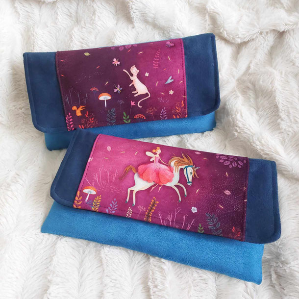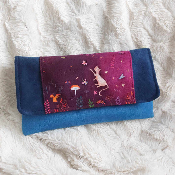 Belle petite pochette pouvant accueillir votre chéquier, cartes et argent liquide ainsi ou vos lunettes. Pratique et esthétique avec son bel imprimé de velours figurant une charmante chatte entourée d'un papillon, d'un écureuil, de fleurs et d'un champignon. Suédine douce au touché velouté -bleu denim et turquoise. Intérieur en tissu matelassé  noir, fermé par un bouton pression aimanté.