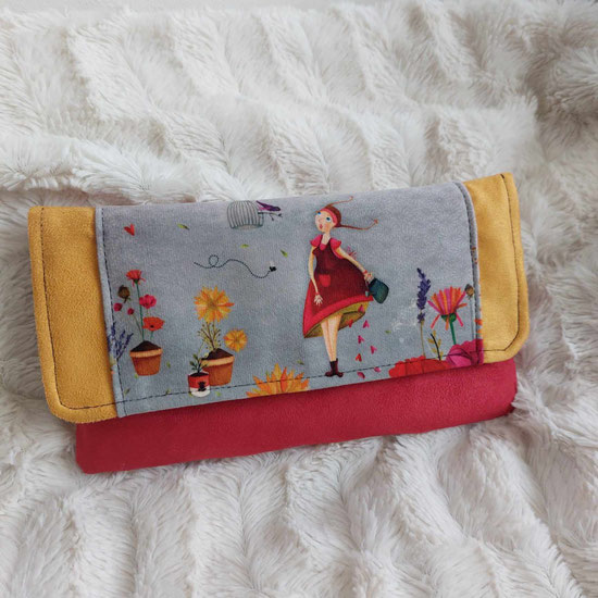 Belle petite pochette pouvant accueillir votre chéquier ( format porte-feuille), cartes et argent liquide ainsi ou vos lunettes. Pratique et esthétique avec son bel imprimé de velours figurant une jardinière entourée de fleurs, d'un oiseau sorti de sa cage, d'une abeille. Suédine douce au touché velouté jaune moutarde et bordeaux Intérieur en tissu matelassé noir, fermé par un bouton pression aimanté.