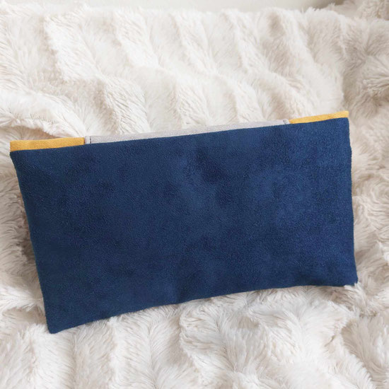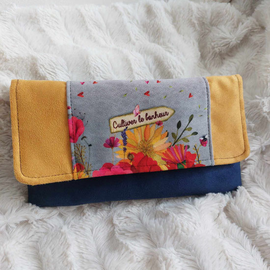 Belle petite pochette pouvant accueillir votre chéquier ( format porte-feuille), cartes et argent liquide ou vos lunettes. Pratique et esthétique avec son bel imprimé de velours figurant des fleurs aux couleurs éclatantes telles que des coquelicots, des cosmos, de la lavande, un papillon et une abeille, avec l'inscription "cultiver le bonheur". Belle breloque en métal de couleur bronze en forme de papillon. Suédine douce au touché velouté bleu jean et jaune moutarde.  Intérieur en tissu matelassé  noir, fermé par un bouton pression aimanté.