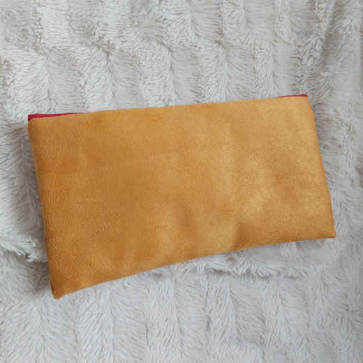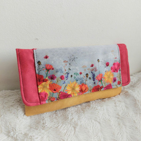 Belle petite pochette pouvant accueillir votre chéquier, cartes, lunettes ou argent liquide... Pratique et esthétique avec son style bucolique figuré par un magnifique tissu mettant en scène des fleurs aux couleurs chatoyantes . Suédine douce au touché velouté jaune moutarde et rouge; Intérieur en tissu matelassé noir, fermé par un bouton pression aimanté;