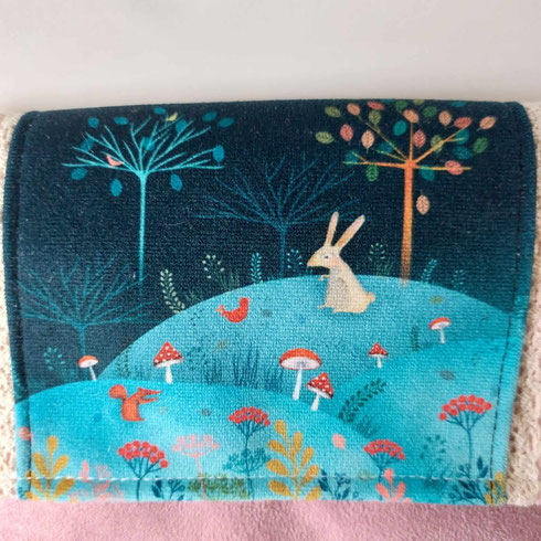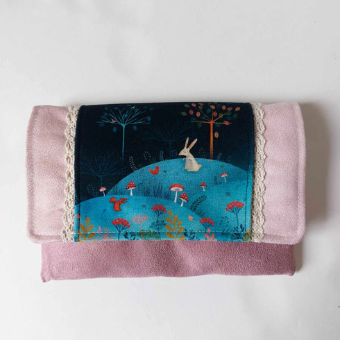 Belle petite pochette pouvant accueillir votre chéquier ( format porte-feuille), cartes et argent liquide ou vos lunettes. Pratique et esthétique avec son bel imprimé de velours figurant des animaux et une forêt.Dentelle écrue; Suédine douce au touché velouté bleu jean rose et vieux rose. Intérieur en tissu matelassé blanc et noir, fermé par un bouton pression aimanté;