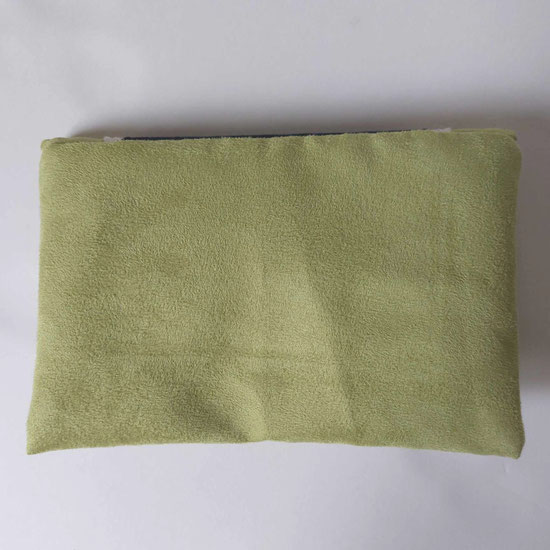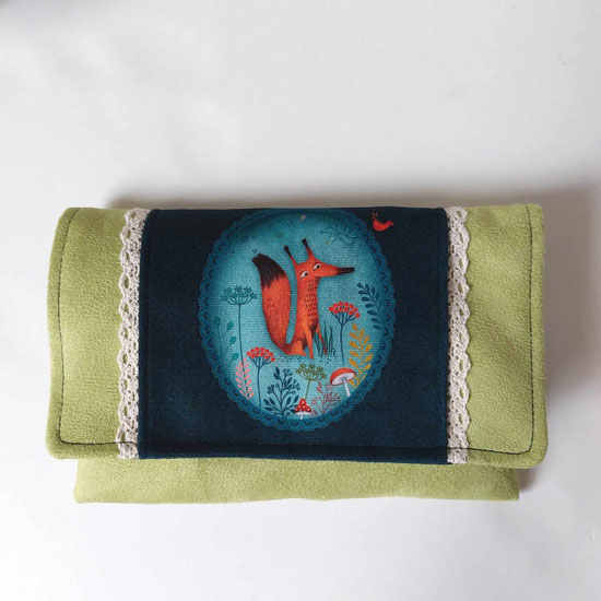 Belle petite pochette pouvant accueillir votre chéquier ( format porte-feuille), cartes et argent liquide ou vos lunettes. Pratique et esthétique avec son bel imprimé de velours figurant un renard entouré de fleurs et de champignons, d'un oiseau. dentelle écrue. Suédine douce au touché velouté vert pomme. Intérieur en tissu matelassé noir, fermé par un bouton pression aimanté;