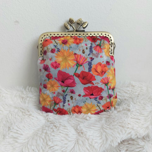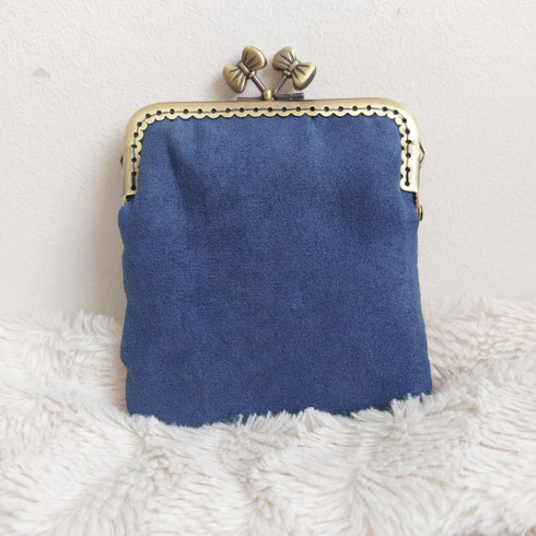Ravissant petit porte-monnaie monté sur un fermoir en couleur bronze, avec de jolis noeuds papillon en guise de claps. Pratique et esthétique avec son style bucolique figuré par un magnifique tissu de velours mettant en scène des fleurs aux couleurs chatoyantes . Suédine douce au touché velouté bleu jean ; Intérieur en tissu matelassé noir
