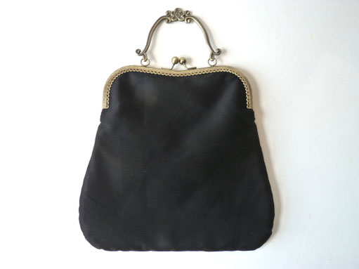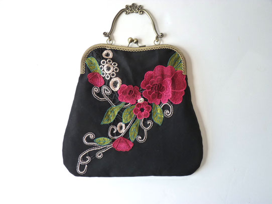 Belle pochette montée sur un fermoir (métal couleur bronze) muni d'une anse agrémentée de jolies fleurs, aux belles ciselures. Satin de coton noir. Magnifique guipure figurant des fleurs
