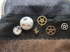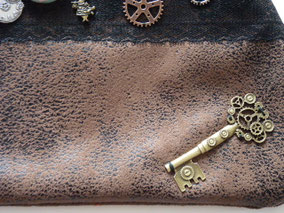 Belle pochette rétro futuriste montée sur fermoir couleur bronze, ciselé et muni d'une anse. suédine noire velouté, suédine marron ,souple et douce à l'aspect cuir vieilli. Dentelle noire, breloques en forme d'engrenages, bouton de trissu représentant une chapelière toquée, une breloque représentant le lapin d'Alice. Une magnifique breloque en forme de clef avec engrenages. Intérieur en polaire noir. Pour voyageuse dans le temps stylée!