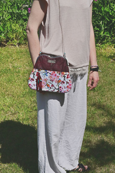 Belle pochette montée sur un fermoir aux courbes de "M", très féminin (métal gris foncé, couleur graphite). Imprimé sakura ou fleurs de cerisier mêlant des nuances de rose, fuchsia orange, rouge,
