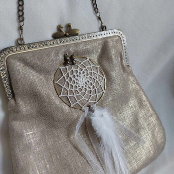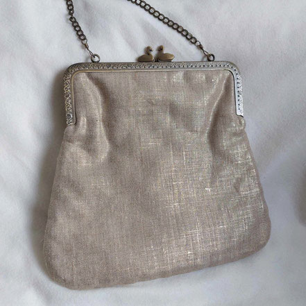 du fermoir. Petite breloque bronze formant un papillon, donnant à l'ensemble une petite touche de poésie. Lin naturel lamé or, matière noble. Intérieur en tissu matelassé ivoire.