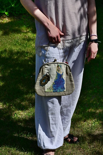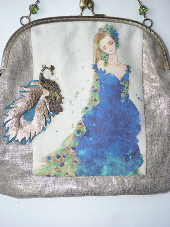 Magnifique pochette montée sur un fermoir en métal couleur bronze, représentant une femme vêtue d'une belle robe bleue avec des plumes de paon en guise de cape. Ce personnage, au graphisme d'un manga, me fait penser à Héra, déesse grecque du mariage, dans un moment de rêverie douce. Breloque en métal bronze formant un paon, mis en valeur par une plume découpée dans du cuir de chèvre dorée et du cuir d'agneau bleu. Lin lamé or, aux beaux reflets dorés lorsque la lumière vient s'y posait. anse formé de maillons en cuivre revêtement bronze, que j'ai moi-même formé. Perles de bohème facettées, transparentes, aux reflets vert; Intérieur en tissu ivoire légèrement matelassé Cette pochette sublimera votre tenue de mariage ou votre robe lors de soirées chics!