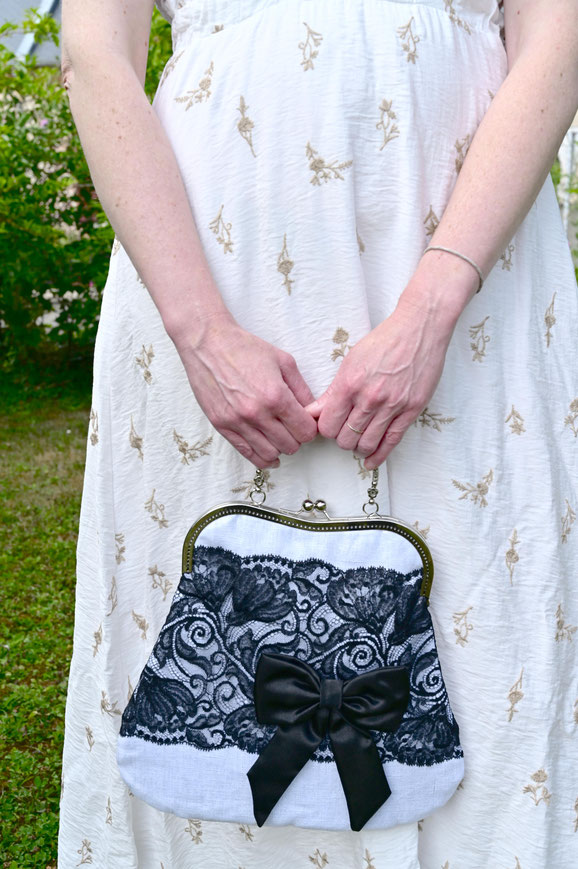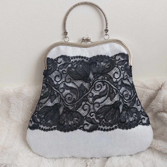 Belle pochette au magnifique fermoir avec anse ciselé (métal couleur argenté ) au charme rétro chic, très romantique, idéal pour sublimer vos tenues lors d'un mariage ou d'une soirée chic et élégante. Composée dans du lin blanc lamé argent. Belle dentelle noire de Calais au motif floral de roses.