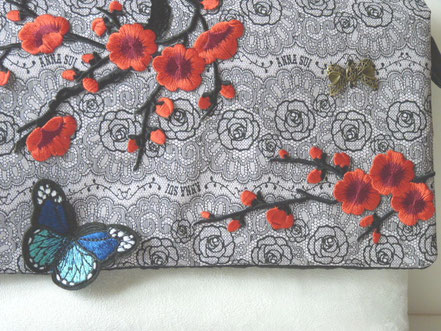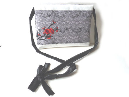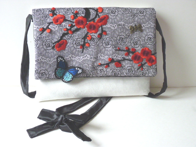 Sac à main pochette imprimé dentelle et guipure fleurs cerisiers et papillon japonisant fait main l'Arche de Jessica