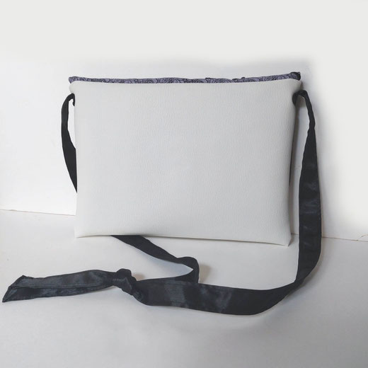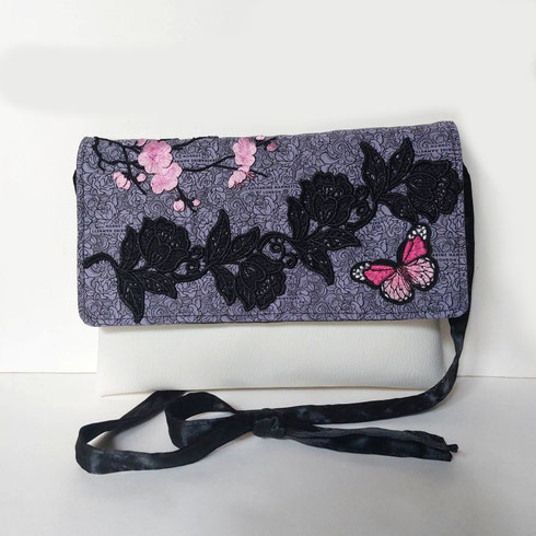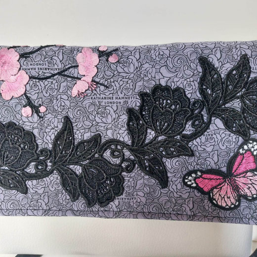 Magnifique sac, ultra féminin avec imprimé aux motifs de roses, estampillé Katharine Hamnet London, romantique à souhait, avec sa guipure figurant des des roses et son applique formant des fleurs de cerisiers roses, à l'esprit japonisant, toutes deux cousues avec délicatesse à la main. Ecusson représentant un beau papillon rose. Cette pochette, composée de simili cuir blanc, facile à entretenir , sera un bel accessoire pour accompagné votre tenue lors de soirée romantiques et raffinées. Munies d'anses de satin noir réglables, à nouer en noeuds papillon. Intérieur en tissu matelassé noir. Rabat fermé par un bouton pression aimanté.