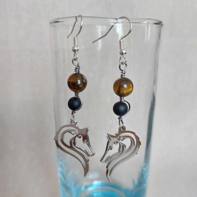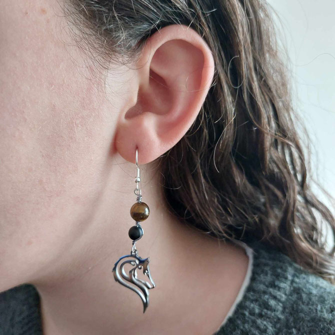 Boucles d'oreilles loup oeil de tigre onyx fait main l' Arche de Jessica