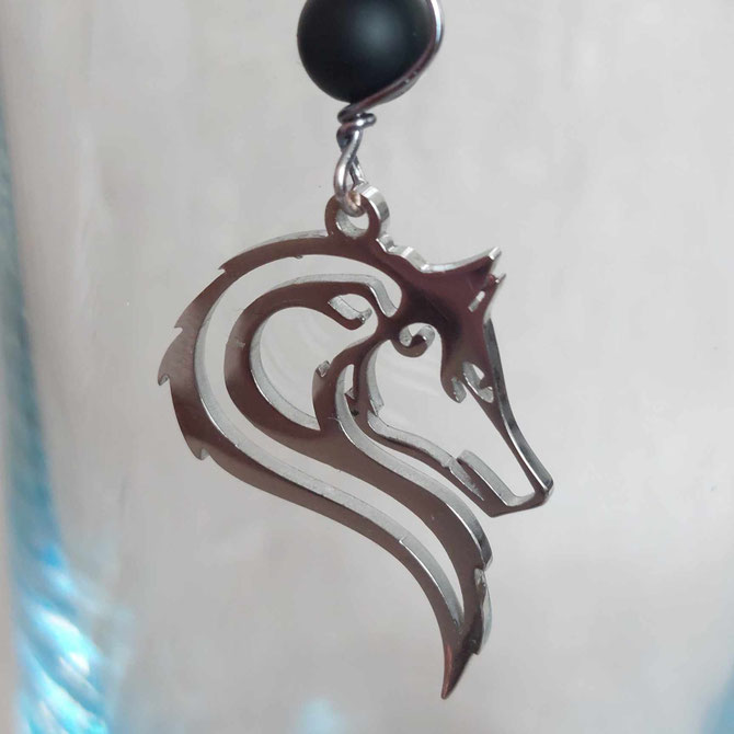 Magnifiques boucles d'oreilles figurant des breloques formant des têtes de loup, en acier inoxydable.
