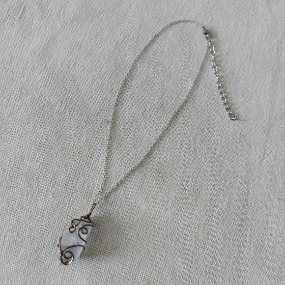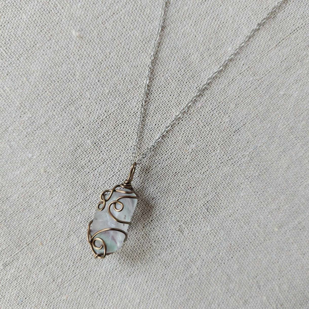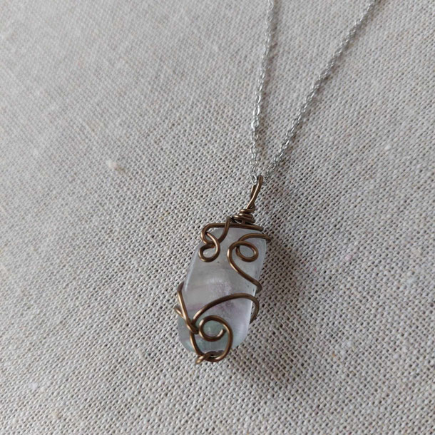 Collier en acier inoxydable portant une magnifique fluorite ( pierre non percée de 2,5 cm de hauteur) aux multiples et fascinants reflets. Relier à la chaîne grâce à du fil de cuivre au revêtement bronze que j'ai torsadé.