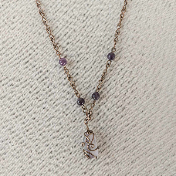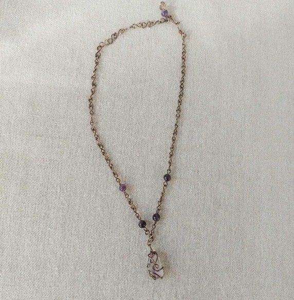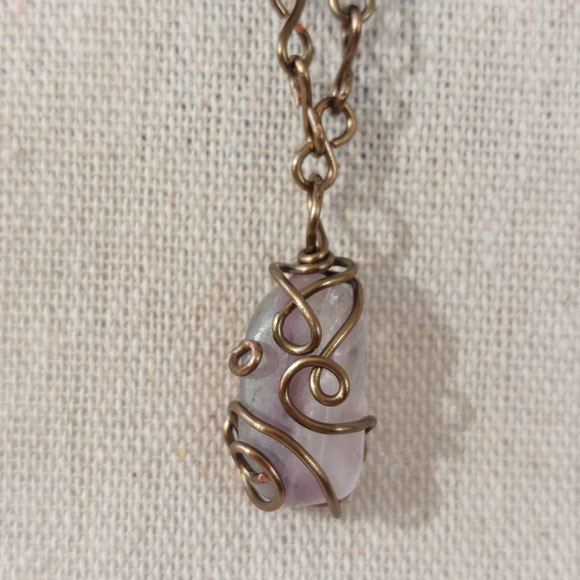 Collier en cuivre au revêtement couleur bronze portant une magnifique fluorite ( pierre non percée de 2,5 cm de hauteur) aux multiples et fascinants reflets. Perles d' améthystes de 6 mm de diamètre.