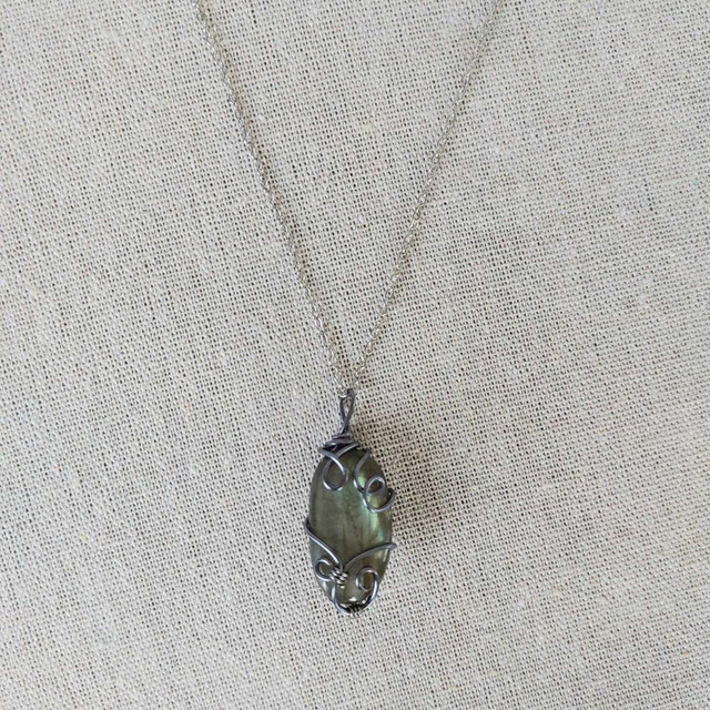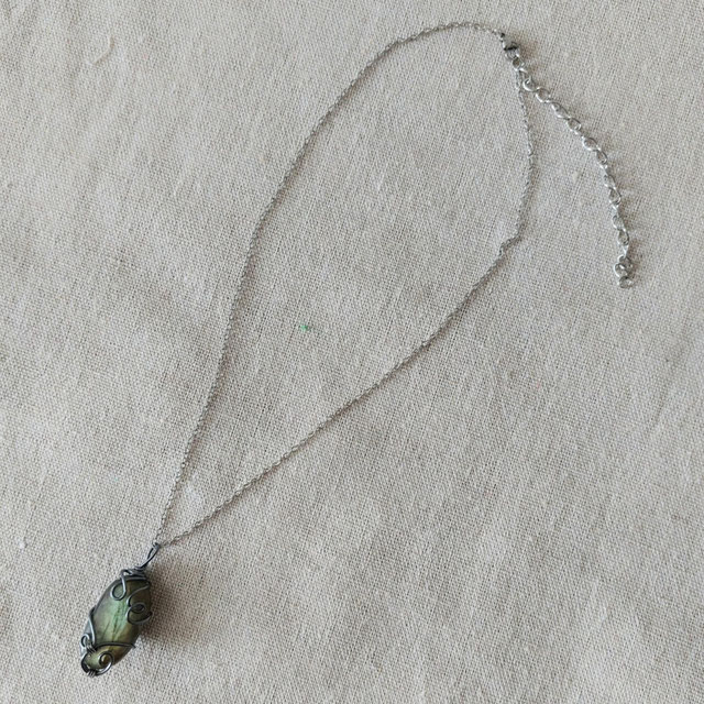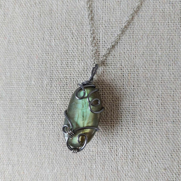 Collier en acier inoxydable portant une magnifique labradorite ( pierre non percée de 3 cm de hauteur) aux multiples et fascinants reflets. Relier à la chaîne grâce à du fil de cuivre au revêtement argenté que j'ai torsadé.