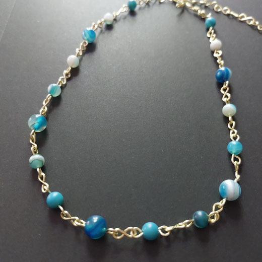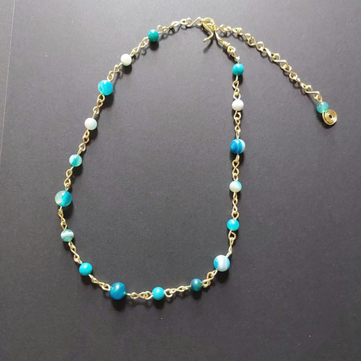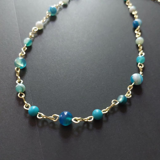 Collier composé de maillons et fermoir en cuivre au revêtement couleur or/champagne, façonnés par mes soins. Perles d'agates bleues transparentes aux beaux anneaux/vagues de différents bleus 8 mm et de 6 mm de diamètre.