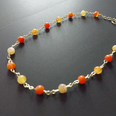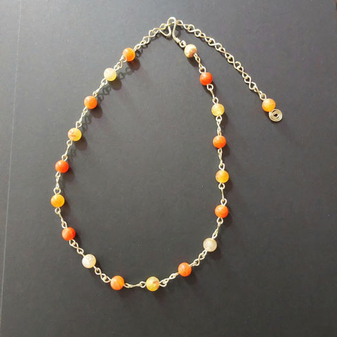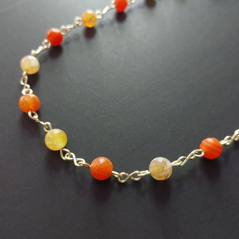 Collier composé de maillons et fermoir en cuivre au revêtement couleur or/champagne, façonnés par mes soins. Perles d'agates aux multiples nuances oranges et jolies craquelures de 8 mm de diamètre.
