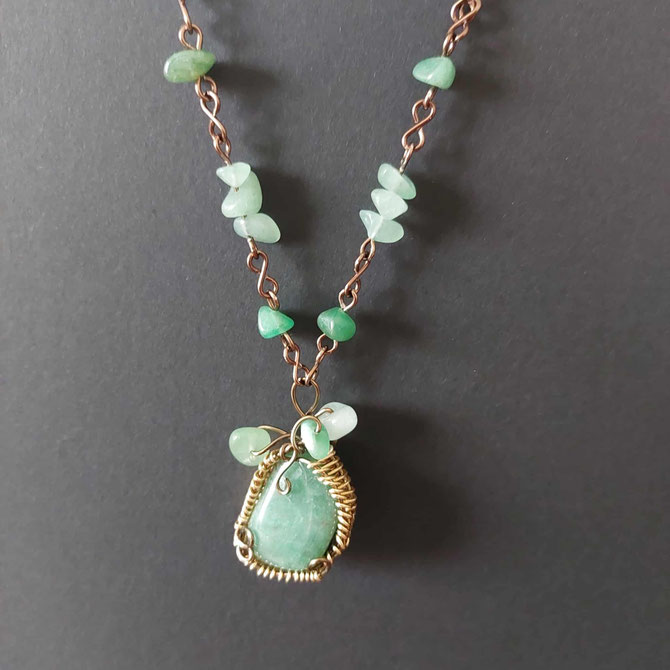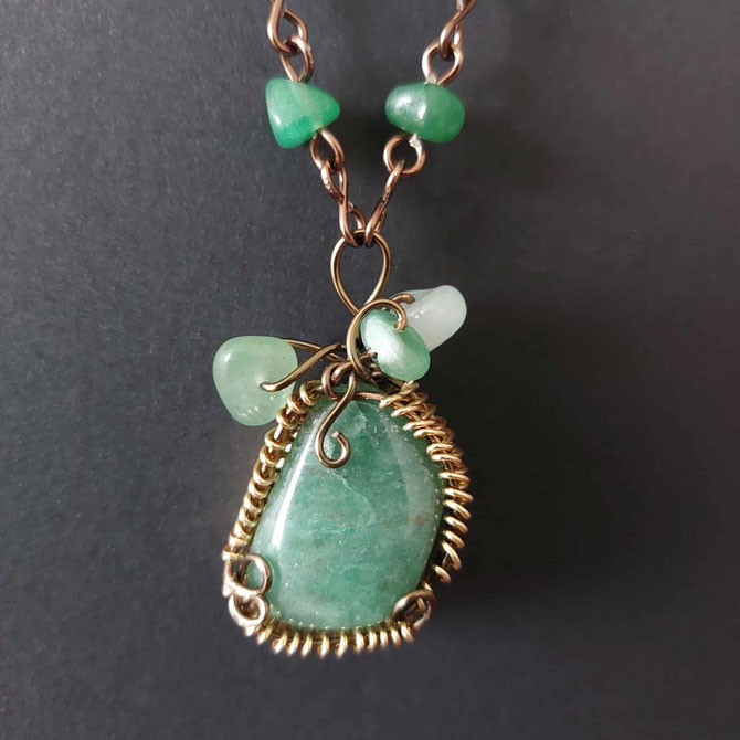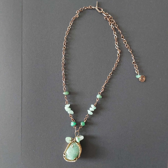 Collier composé de maillons et fermoir en cuivre au revêtement couleur or/champagne et bronze, façonnés par mes soins. Perles/chips et magnifique pierre non percée ( 2,5 cm de hauteur ) en aventurine verte.