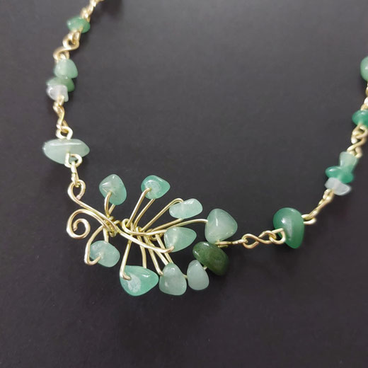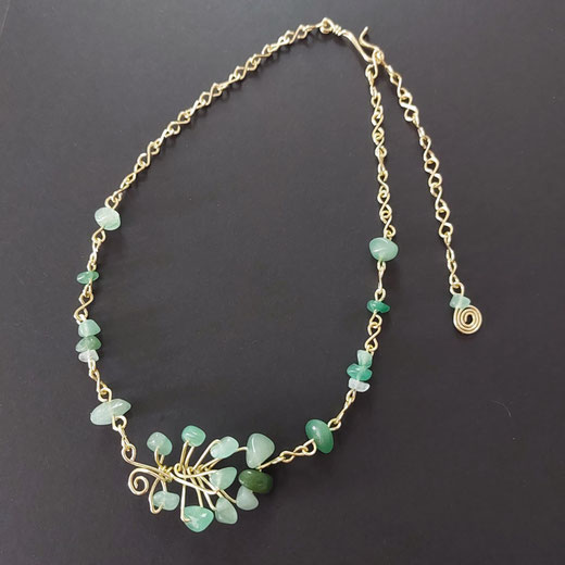 Collier composé de maillons et fermoir en cuivre au revêtement couleur or/champagne, façonnés par mes soins. Perles d'aventurine en chips