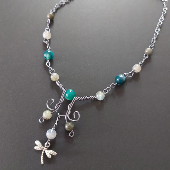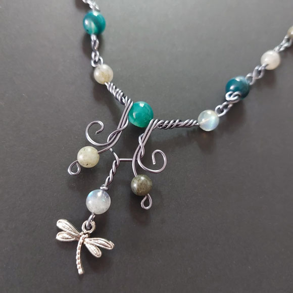 Collier agate bleue paon labradorite libellule fait main l' Arche de Jessica