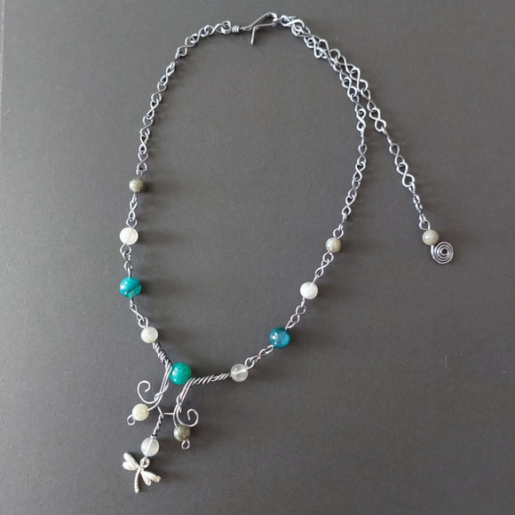 Ravissant collier composé de perles d'agate bleu paon ( 8mm de diamètre )et de labradorites ( 6 mm de diamètre ) montées en collier grâce à du fil de cuivre au revêtement gris/argenté. Une breloque formant une libellule vient apporter sa touche de fantaisie (métal argenté)