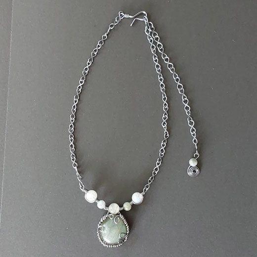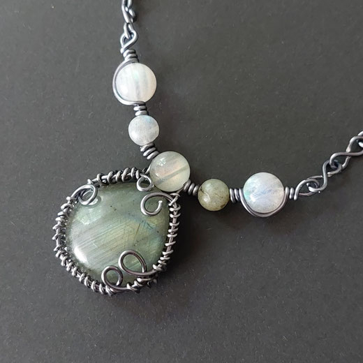 Collier portant une magnifique labradorite ( pierre non percée de 2 cm de hauteur)agrémentée de 5 perles de labradorite ( 6 et 8 mm de diamètre) aux multiples et fascinants reflets, reliées grâce à du fil de cuivre au revêtement argenté que j'ai torsadé.