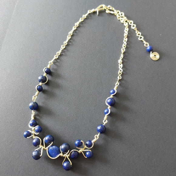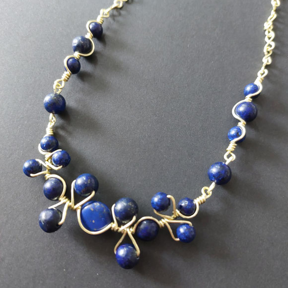 Collier composé de maillons et fermoir en cuivre au revêtement couleur or/champagne façonnés par mes soins. Perles en lapis lazuli aux magnifiques bleu nuit et inclusions dorées