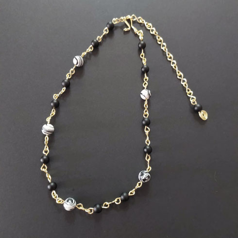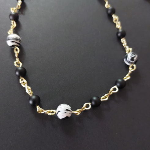 Collier composé de maillons et fermoir en cuivre au revêtement couleur or/champagne, façonnés par mes soins. Perles en malachite synthétique blanche aux zébrures noires de 8 mm et onyx de 6 mm de diamètre.