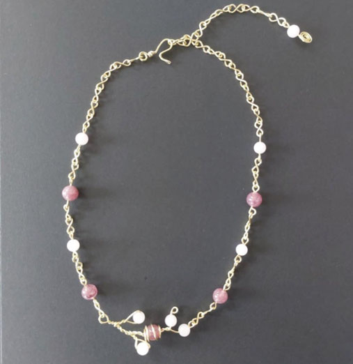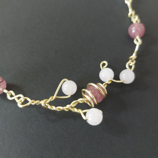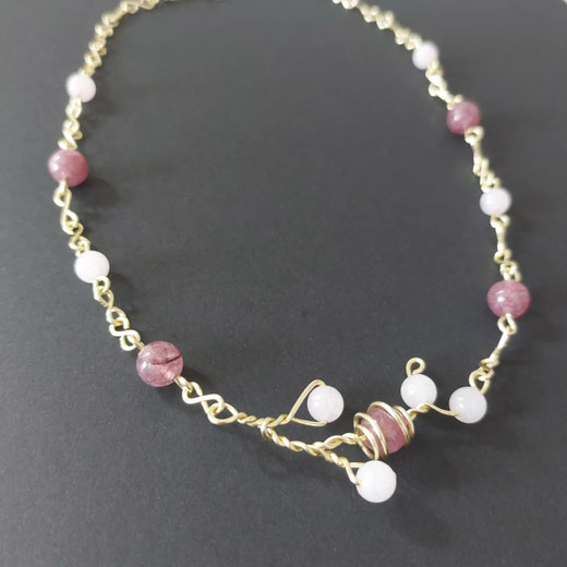 Collier composé de maillons et fermoir en cuivre au revêtement couleur or/champagne, façonnés par mes soins. Perles de lépidolites de 8 mm et quartz rose de 6 mm de diamètre.